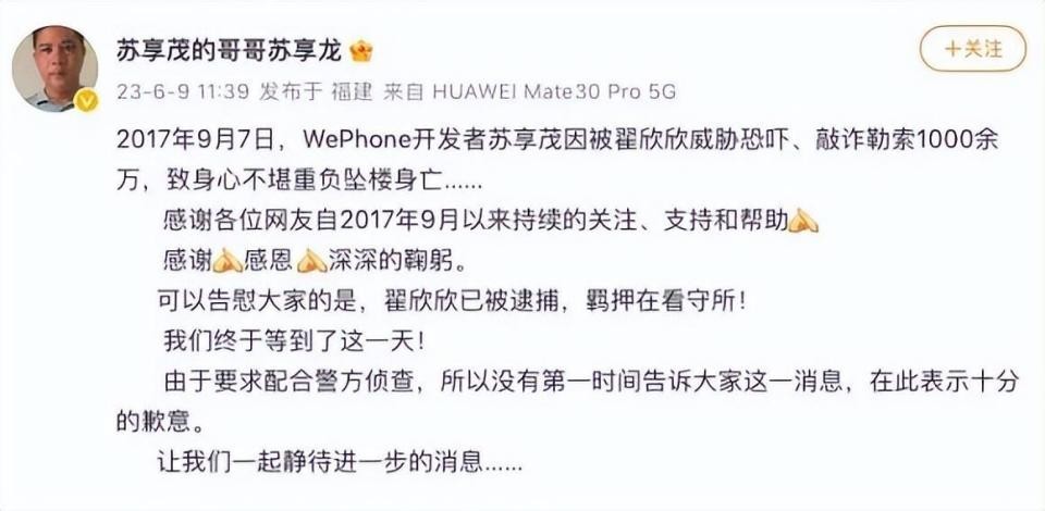苏享茂去世的消息迅速在网上掀起了轩然大波,他的家人在他去世后痛苦不已,并且找了律师起诉翟欣欣敲诈勒索。