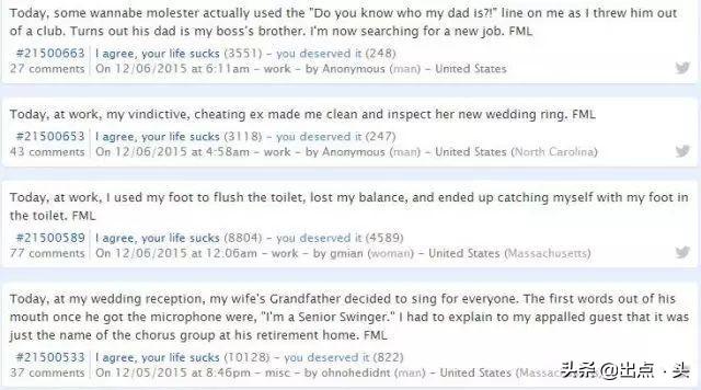 国外还有一个同名的糗事网站,网友在上面发表自己今天遇到的各种好玩的糗事,每个故事都以“Today”开头,以“FML”结尾,故事内容多种多样,满屏都是LOL的段子。