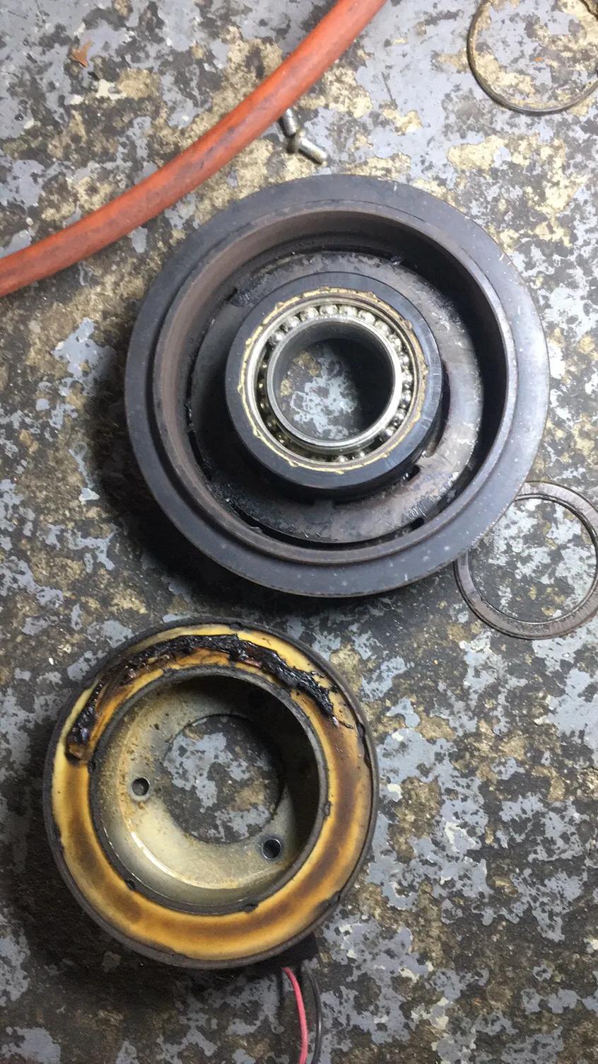 取皮带盘的时候也要小心一点,可以用锤子敲击皮带盘的后面边缘?,同时用翘棒翘住另一边?对称?的位置?,保证两边受力均匀,经过连续敲击,皮带盘慢慢就出来了;最后就看到烧焦的电磁线圈了,三个固定螺丝拆下来就可以更换了,安装简单一点,卡簧和垫片装好一般就不会有问题了,这个是空调突然不冷的情况下一般就是这个线圈换了,如果慢慢不冷的话估计就是空调系统存在漏制冷剂的地方。