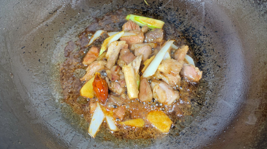2、炒羊肉片不需要焯水,焯水后的羊肉口感吃起来就不鲜嫩了。拿一个干净无水的锅,放入一勺食用油,油热先把羊肉放入大火煸炒一会,再放入葱姜、八角继续翻炒,炒出它们的香味。再放入1勺老抽上色、2勺生抽、少许的白糖、翻炒上色即可。