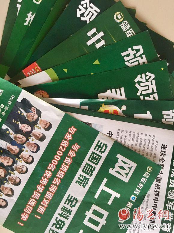 在大量的宣传册中,记者看到投诉者所说的“热烈祝贺领军教育 连续全科大面积押中中考原题 网上中学 全国首家 全科免费 与全省顶级名师面对面”等广告语。