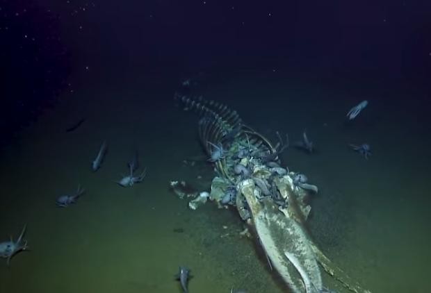深海惊悚一幕:潜水员发现鲸鱼尸体被食腐生物啃食,只留下骨架