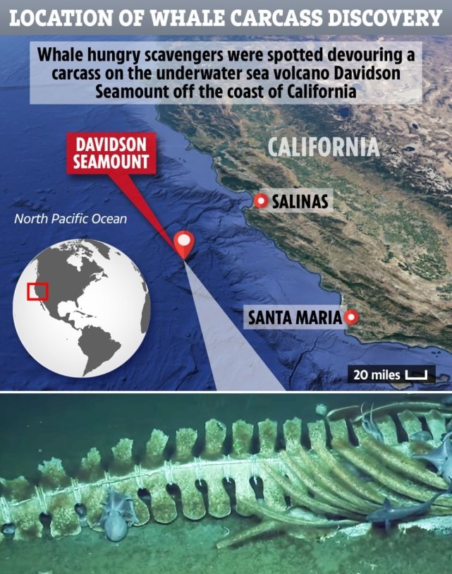 最近,美国一个深海探险团队,“鹦鹉螺号”的潜水员在加利福尼亚海岸外探索水下火山戴维森火山时,发现了一具怪异的生物骨骼残骸正在爬行。海洋专家在油管上发布了这段视频,并解释说:“在今年‘鹦鹉螺号’探险季的最后一次潜水中,我们的团队和来自海军的研究人员在探索加利福尼亚中部海域的戴维森火山时,发现了一具鲸鱼残骸。”
