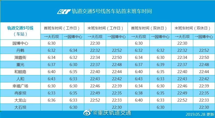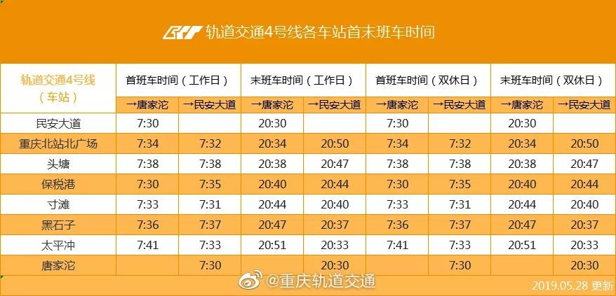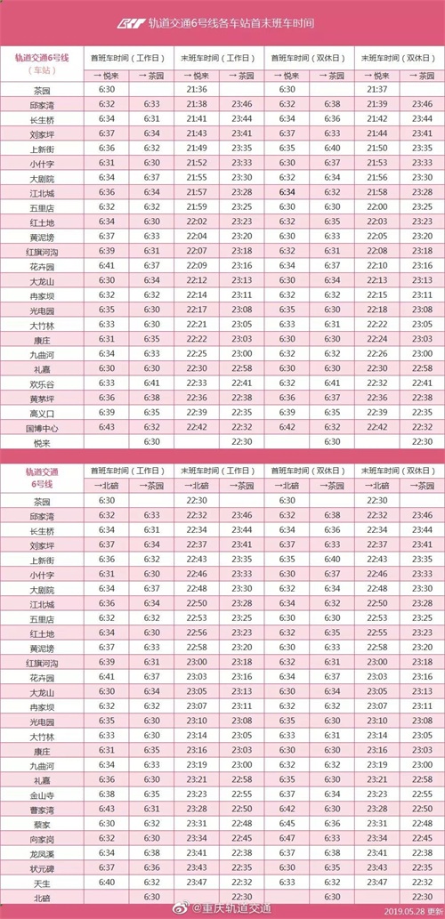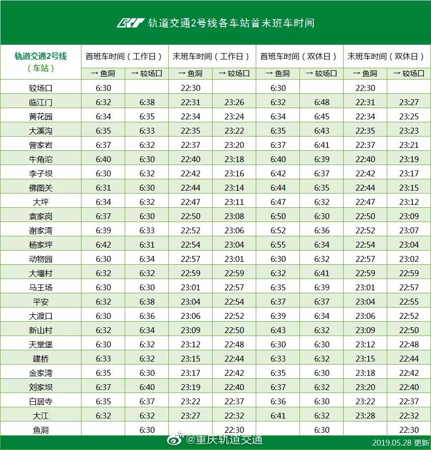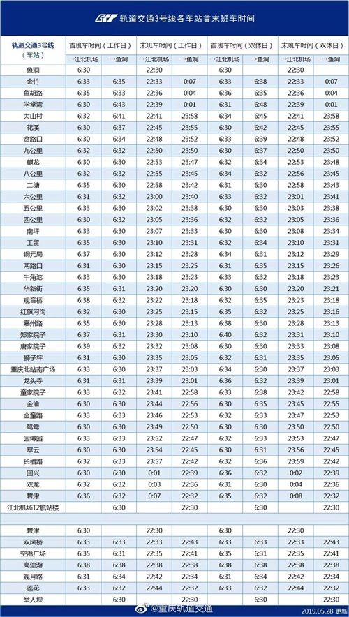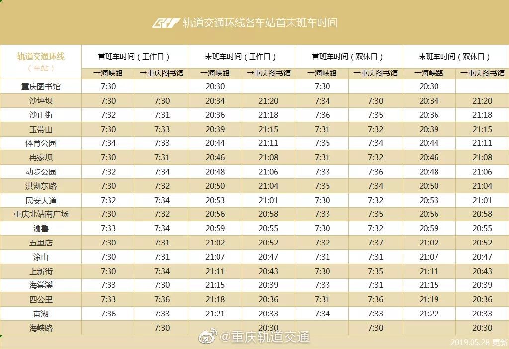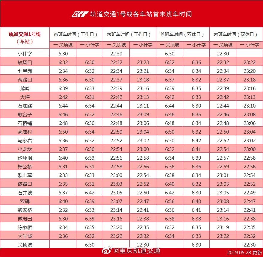 5月29日晚,重庆轨道交通官方微博发布最新运营时刻表。时刻表包括最新的重庆轨道交通已运营线路的首末班车时间、换乘站首末班车时间、轨道交通线网图、各线路失物咨询电话。