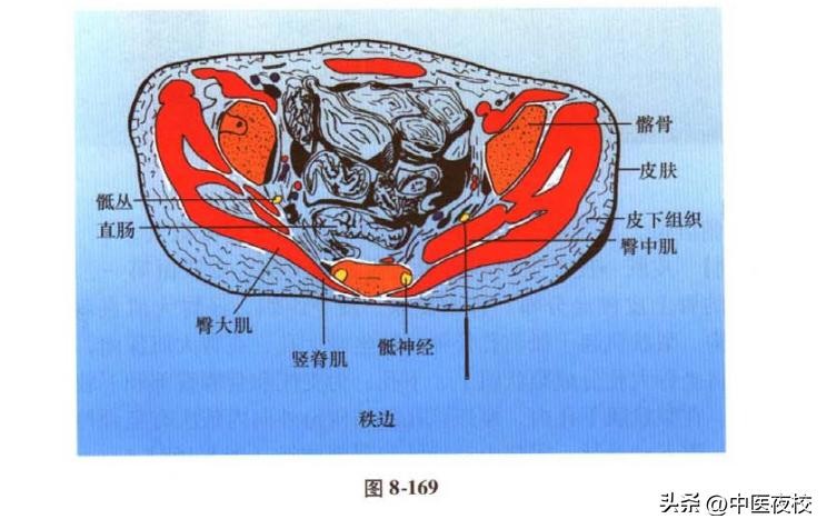 【穴位解剖】 皮肤→皮下组织→臀肌筋膜→大肌。皮肤由第一、第二、第三腰神经后支形成的臀上皮神经分布。针由皮肤、皮下组织,经大肌直刺梨状肌(腱)或其下方的结构。梨状肌起于骶前孔外侧,经坐骨大孔,在大肌深面,向外止于股骨大转子。该肌将坐骨大孔分成梨状肌上、下孔,为支配和营养部和下肢主要神经、血管出入的部位。在梨状肌下孔内,穿经该孔的结构由外向内依次有坐骨神经、股后皮神经、臀下神经、臀下动静脉、阴部内动静脉和阴部神经(图8-168)。
