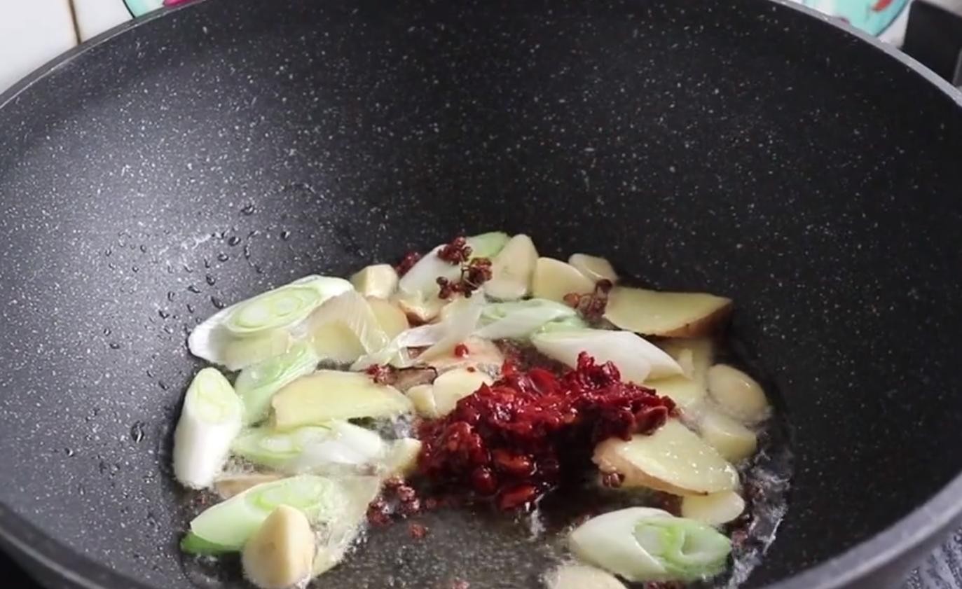 3,起锅烧油下入葱姜蒜爆香,炒香之后加入一勺郫县豆瓣酱,炒出红油,加入火锅底料