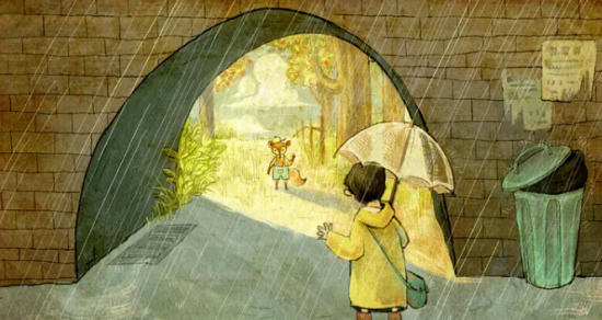 简介:短片类似蜡笔的画风,灰暗的雨季,男孩与狐狸相遇,两个“孩子”两个世界,一个潮湿而压抑的城市,一个明亮而需水的自然,在这个忧愁而留有希望的童话里,在想象打通时空的故事里,一把雨伞一朵花恰好在一起,让人微笑、略觉触动,忆起雨季中的温暖情绪。