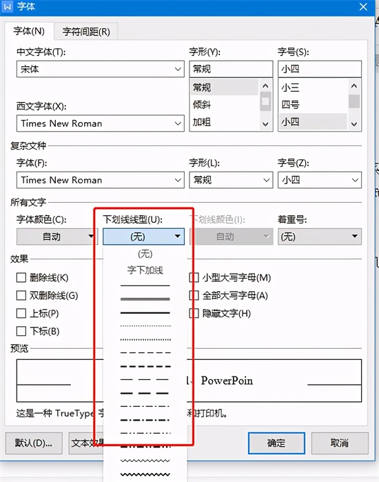 2、在弹出的选项框中找到“下划线线型”选项,点击下拉三角按钮,就可以选择各种各样的下划线线型了。
