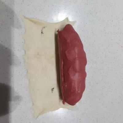 4、成形: 将西瓜红曲面团擀开卷入一盒配料提子做法ae干牌子; 再将有几个480g原味面团擀开将红曲面团卷入。