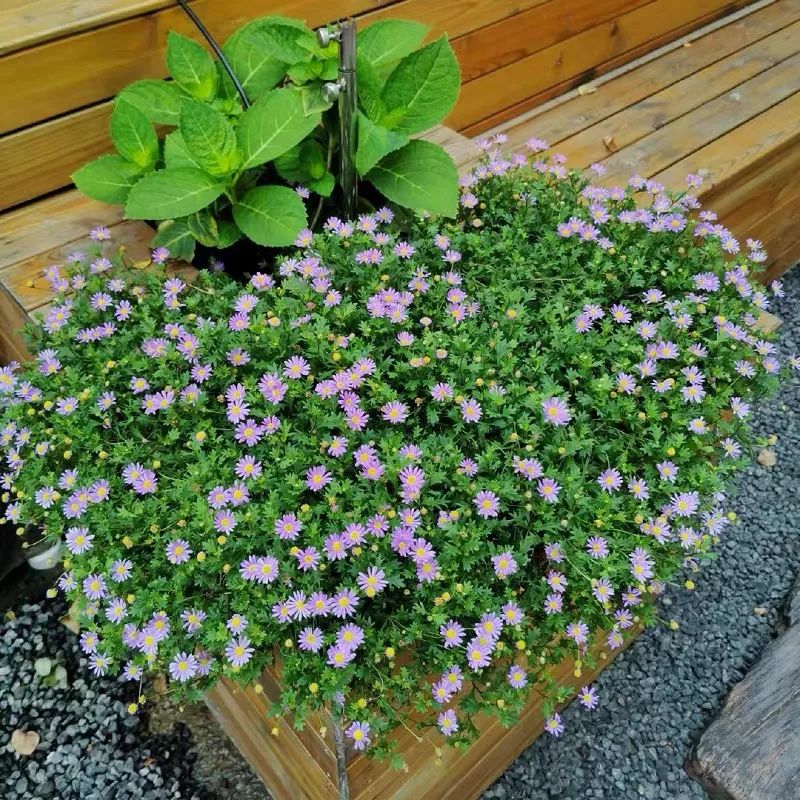 姬小菊这种蓝紫色的小花也属于菊科的草本植物,它的直立性能非常的弱,你用它来装点花盆儿是非常不错的选择,长大了它都能垂下花盆儿,开花性能很强,只要保证温度不低于十度,它就可以一直生长开花。但是阿姬小菊也是比较怕热的,在夏天里它是属于半休眠的状态。所以,在夏天要放在半阴散射光的地方,但是花量也一直持续开,在秋天里再让它爆花,它是非常耐冻的,如果地栽的话零下十几度,它也冻不死。到第二年还会接着开花的,也是非常好养,非常漂亮的,小型的小草花。