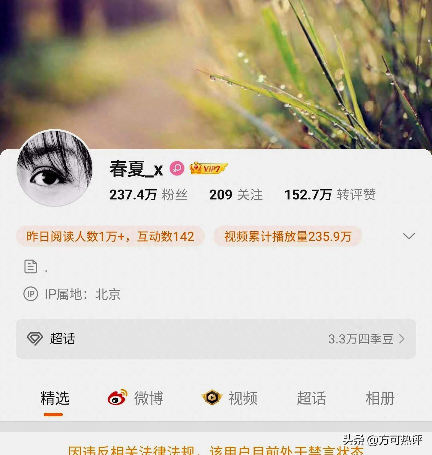 接下来,我们来看看女演员春夏的情况。在2月6日,有网友发现她的社交媒体账号被禁言,原因是“违反相关法律法规”。这一原因令人颇感好奇。