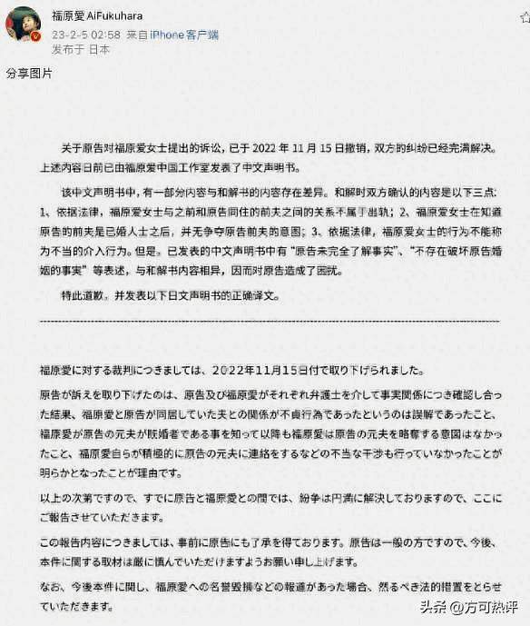 回顾去年8月,福原爱曾被男友的前妻起诉,指控她是第三者,并提出了索赔。然而,令人意外的是,同年11月,对方又发布声明称已经撤销了起诉。然而,福原爱在2月5日半夜发布了双语道歉声明,这次向“横滨男”前妻道歉,她解释道,中文版本的声明与日文和解书内容出现了差异。