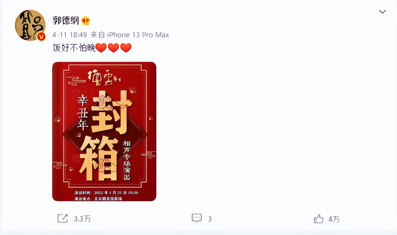 现在,趁着天气和暖,郭德纲将这场“封箱”演出提上日程,并称:“好饭不怕晚”。
