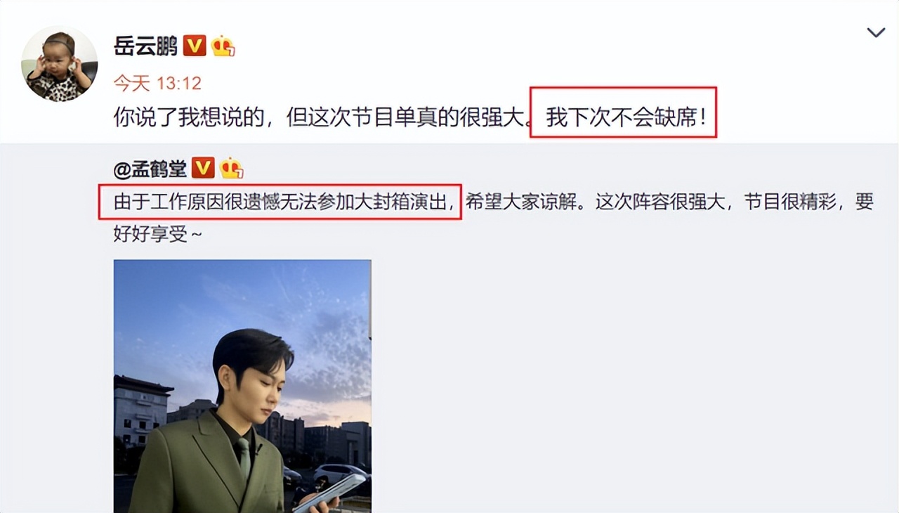 首先是孟鹤堂发文称自己由于工作原因不能参加。