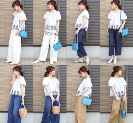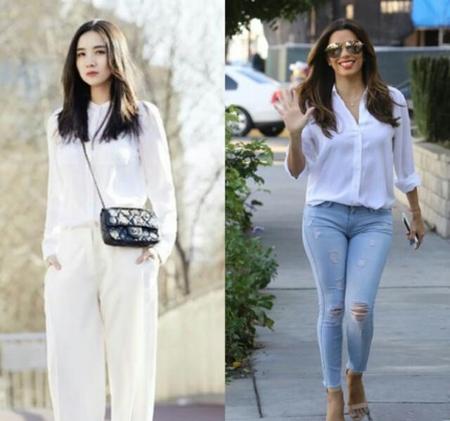 白色阔腿裤与浅色、深色、亮色、图案类上衣搭配的吸睛有味道,脚踩小白鞋清新感也是十足。把上衣的衣角塞进裤腰穿出显高的视觉感,小个子也可以放心尝试。