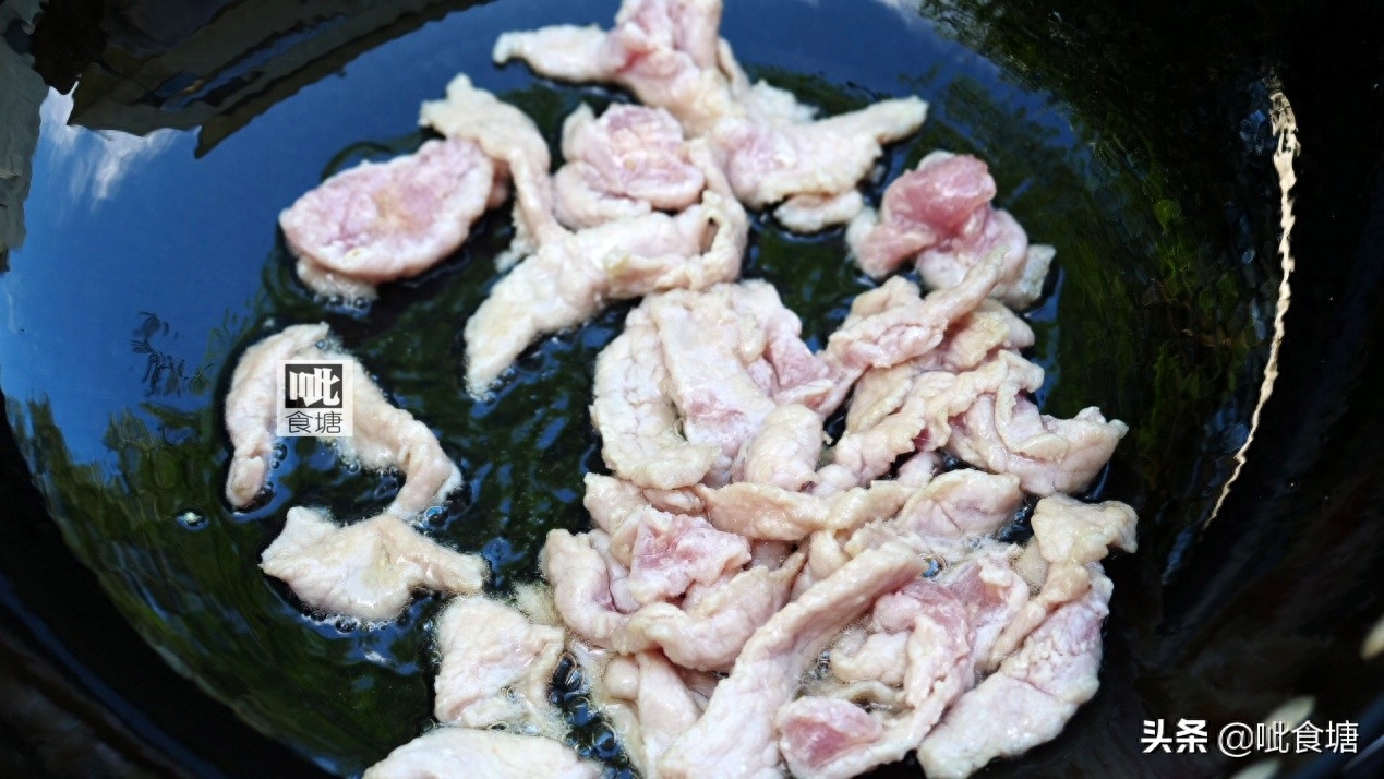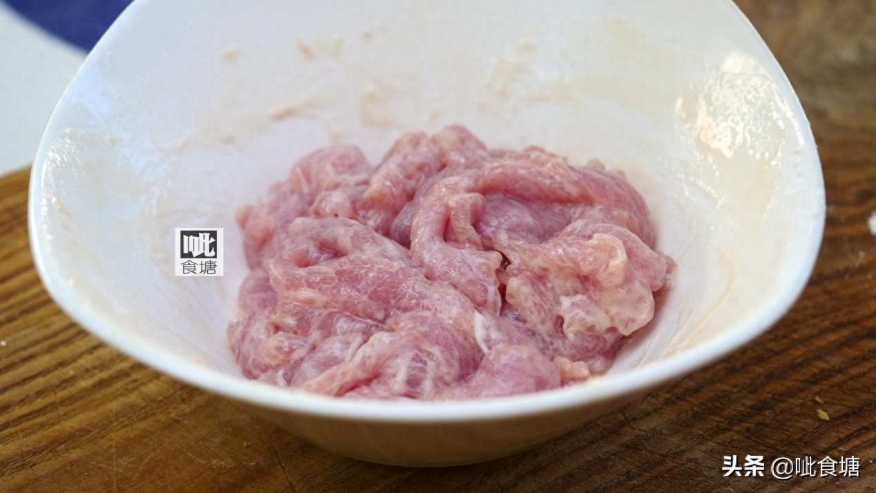 4, 里脊肉断纹切片,其他部位的瘦肉也可以的。加盐料酒淀粉拌匀。