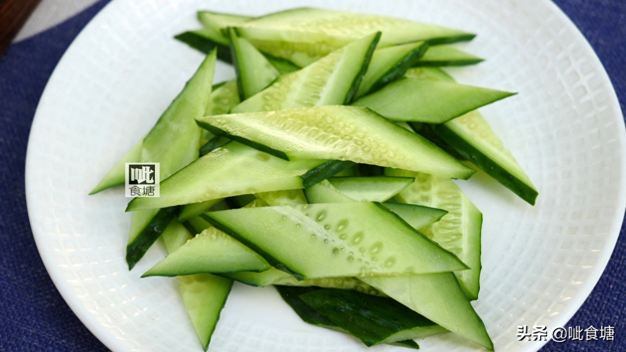 5, 黄瓜洗净后切菱形片。如何切菱形片呢,这个很简单,整根黄瓜斜刀切段,然后再把切好的段立起来,切片就是菱形片了。胡萝卜之类的同理哦。