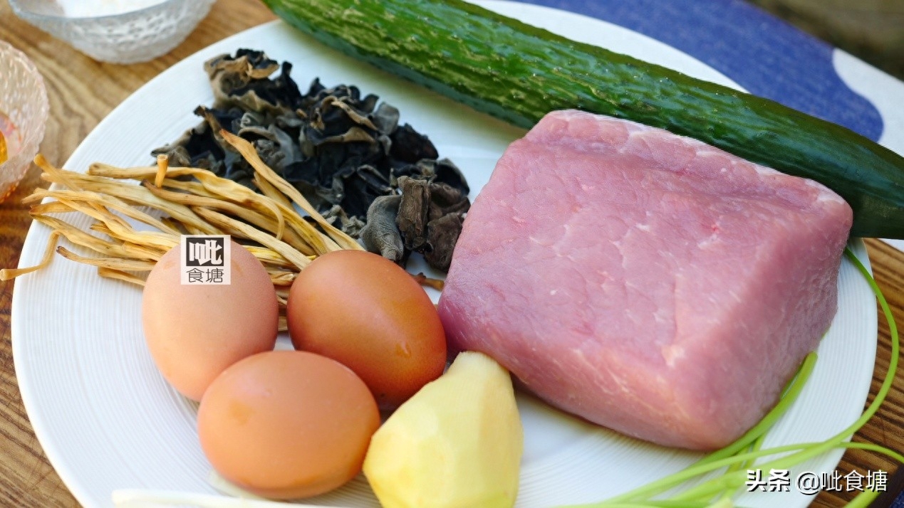 1, 材料:猪里脊肉,木耳,黄花菜,黄瓜,鸡蛋,葱姜,料酒,生抽或者酱油,香油,淀粉