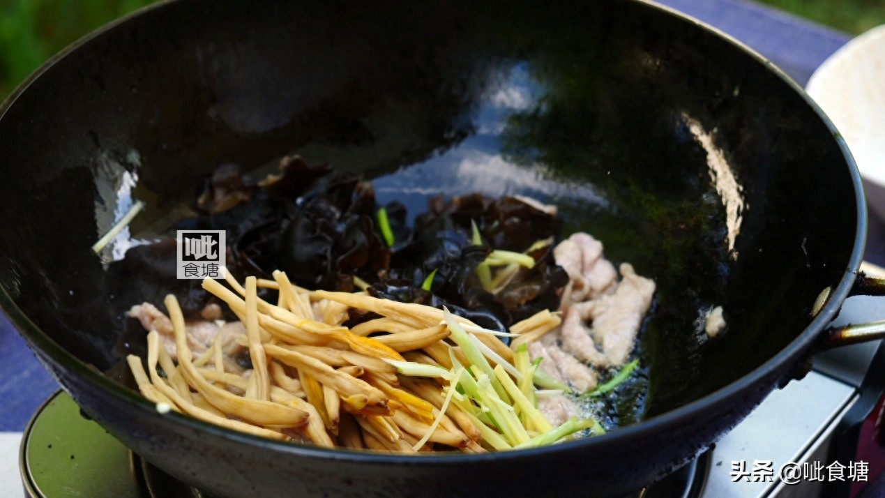 7, 锅里加适量油,炒肉片至变色,然后倒入黄花菜和木耳,葱姜丝炒香。