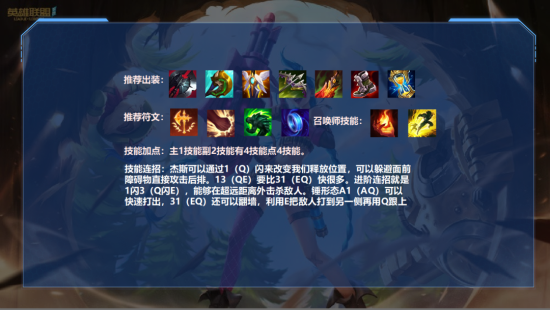 多种不同出装,最后结合出来一套完美出装。首先我们来看一下当前版本杰斯的优势点都在哪里:爆发高、攻击距离远、拉扯能力强、支援速度快、分推能力优秀。所以现在版本的杰斯不管是对线、打团还是单带都非常强,这也是我一直推荐他的原因。