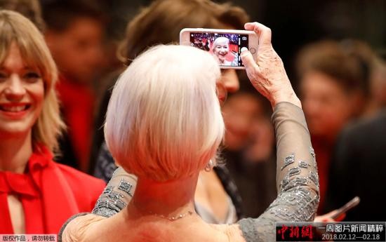 2025年2月15日,德国柏林第68届柏林国际电影节,女演员海伦·米伦在红毯上玩自拍。