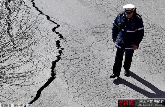 当地时间2月15日,意大利罗马,一名警察在裂缝的道路上行走。当日,这条马路下陷形成一个巨大的天坑,有六辆车被吞没。