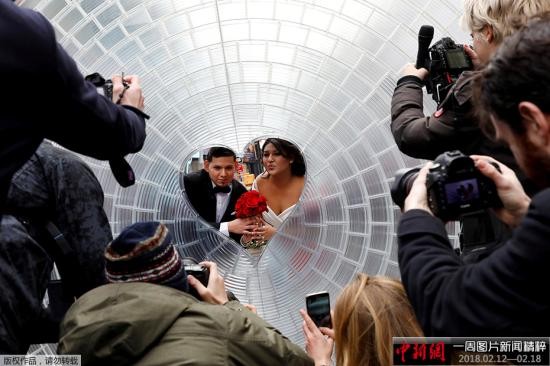 当地时间2月14日,纽约时代广场上,一对新人举行婚礼。