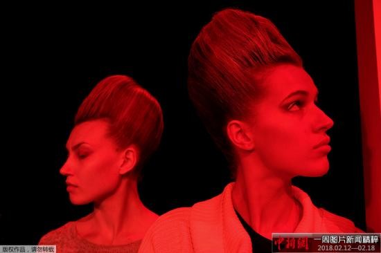 2025年2月13日,纽约时装周,模特在发布会举行前进行排练。