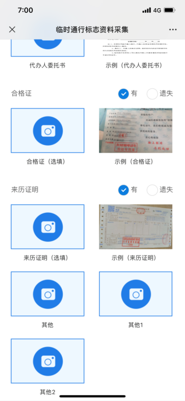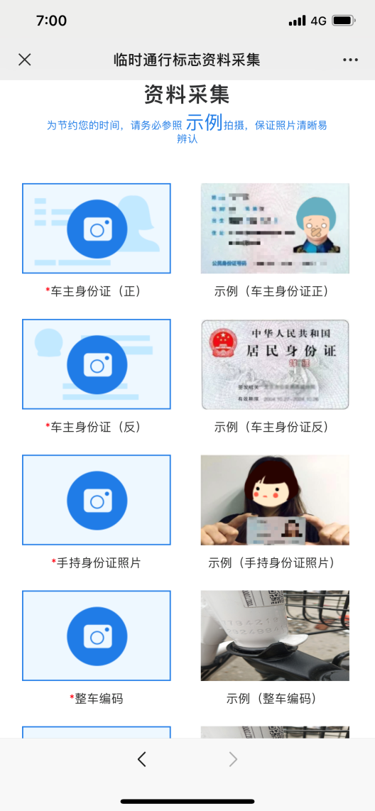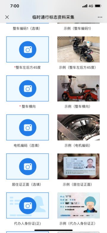 可参考右方示例拍摄相关材料,其中车辆“整车编码”、“电机编码”、“车主身份证正面”、“车主身份证反面”、“整车左后方45度”打*号为必采集项。合格证或发票遗失可点击遗失,可查看拍摄模板。