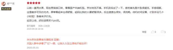 比如在京东平台上,有消费者如此评价nova7 SE手机——“以前一直用苹果,现在想换换口味,看看国产中端机型。京东物流不错。手机到后试了一下,感觉首先是外形很潮流,手感细腻,这是触手可及的优点。屏幕看起来也很舒服,起码比我的11要舒服很多。反应速度也很快,很流畅。待机时间没看,才到手没几个小时呢!急着来评价先。拭目以待,好的话再买个pro玩。”