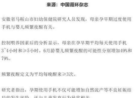 这里我看到一个很有用的新闻,和大家分享,安徽省马鞍山市妇幼保健院研究人员表示,如果妈妈在孕早期平均每天使用手机3~4小时和≥5小时,6月龄婴儿频繁夜醒的可能性分别增加49%和79%。