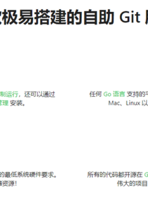 功能特性支持活动时间线支持 SSH 以及 HTTP/HTTPS 协议支持 SMTP、LDAP 和反向代理的用户认证支持反向代理子路径支持用户、组织和仓库管理系统支持添加和删除仓库协作者支持仓库和组织级别 Web 钩子(包括 Slack 集成)支持仓库 Git 钩子和部署密钥支持仓库工单(Issue)、合并请求(Pull Request)以及 Wiki支持迁移和镜像仓库以及它的 Wiki支持在线编辑仓库文件和 Wiki支持自定义源的 Gravatar 和 Federated Avatar支持邮件服务支持后台管理面板支持 MySQL、PostgreSQL、SQLite3、MSSQL 和 TiDB(MySQL) 数据库支持多语言本地化(21 种语言)支持软件包注册中心(Composer/Conan/Container/Generic/Helm/Maven/NPM/Nuget/PyPI/RubyGems)安装