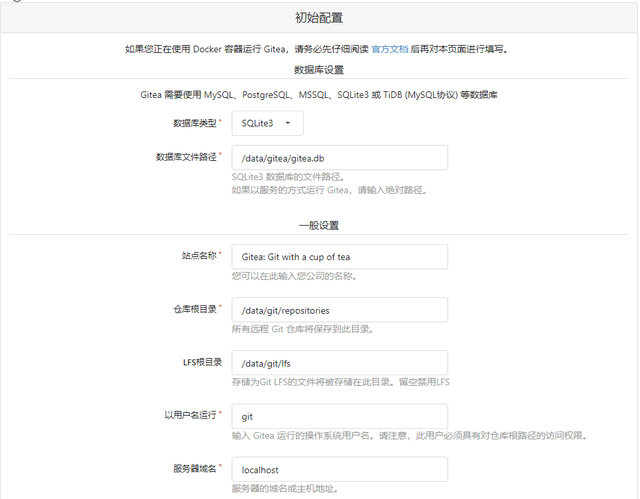 其中环境变量的配置很多,我们可以在官方文档中查看,这里主要修改一下SSH_PORT的端口,因为默认使用22端口,这会和主机的ssh服务端口冲突,因此我们修改一下端口为2222,3000端口为网页管理端口,其他的配置在第一次访问时会通过网页的方式配置。