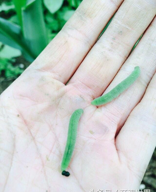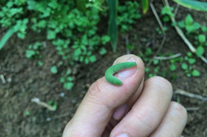 菜青虫,在玉米地里拔草的时候发现的,它的颜色很漂亮,绿绿的还带粉。