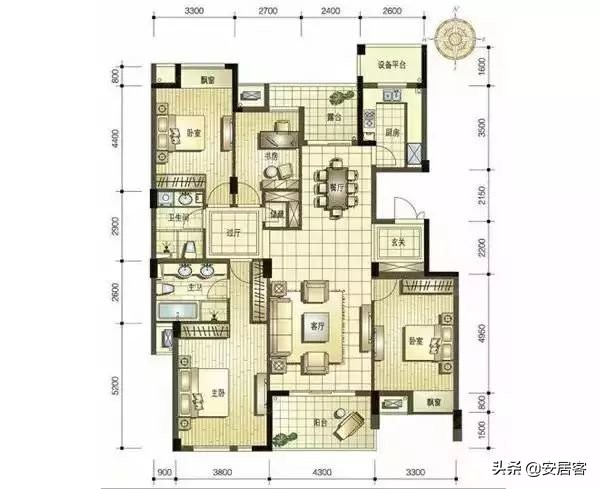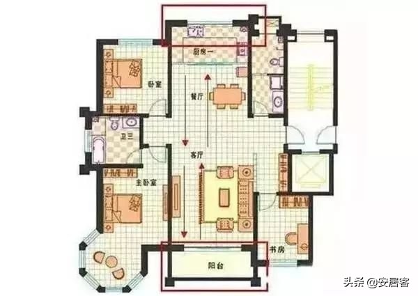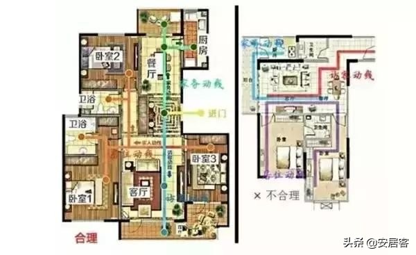 来客动线:是指客人从入户门到客厅到餐厅以及公共卫生间的行动路线,好的来客动线最好是跟家务动线和居住动线没有交叉。