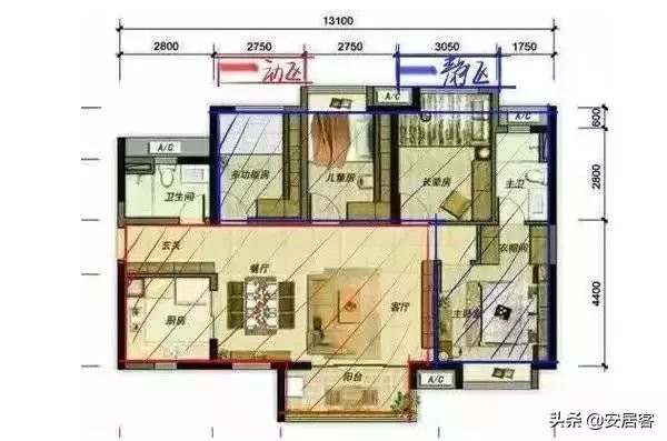 所谓“动静分离”,就是把动区(客厅、厨房、餐厅等)跟静区(卧室、书房等)通过合理的空间布局给分离开来。
