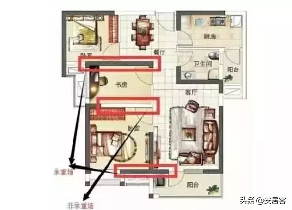 ④通过部位判断:外墙通常都是承重墙,和邻居共用的墙也是。一般的非承重墙在卫生间、储藏间、厨房及过道。