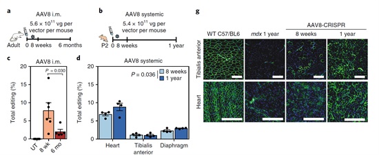 本项研究显示,通过静脉单次注射AAV8装载的CRISPR后,基因组编辑效果在肌营养不良症的小鼠模型中可持续长达1年的时间。此外,在此期间抗肌萎缩蛋白表达的恢复得以维持。