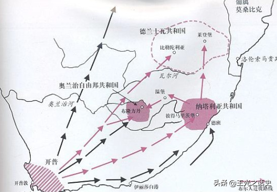 布尔人们在南非北部地区建立了两个自治共和国——奥兰治自治邦(Orange free state)和德兰士瓦共和国(Transvaal Republic)。