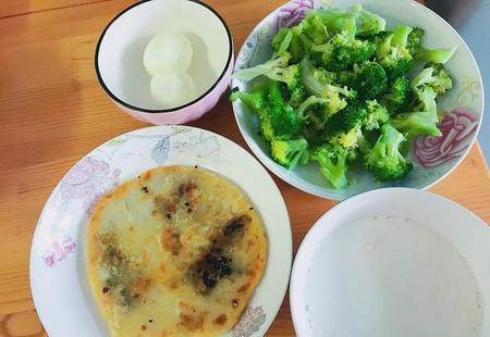 第三种:牛奶燕麦、凉拌西兰花、红糖饼和鸡蛋。