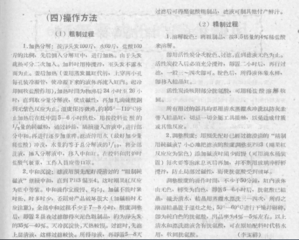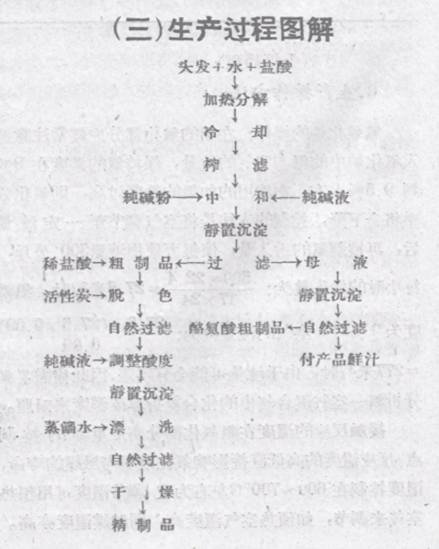 文章详细的介绍了用头发等角蛋白原料来生产胱氨酸的工艺,包括设备、原料、生产流程,操作方法,甚至连各类氨基酸的产率都标注了出来。