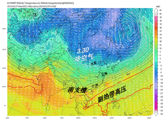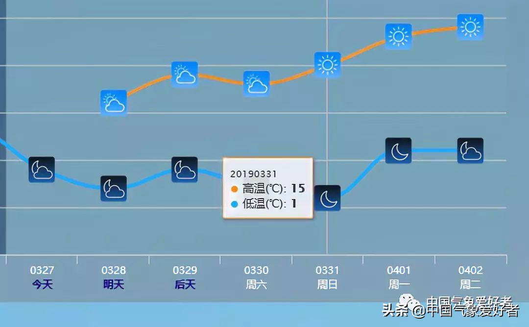 为什么南方会是重点?因为第一,现在马上就是4月了,太阳向着暖空气,冷空气再强,太阳一晒也威力大减。因此,大晴天居多的北方,也就夜里稍微降降温,白天很难降温甚至还要升温;第二,有3.27冷空气降温打底。以北京为例,3.30冷空气会把夜间低温打到1度左右,只是降个两三度;但白天的高温,还是十几度,根本不降。