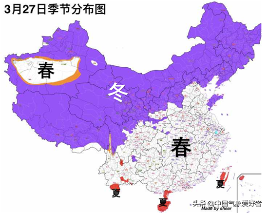 这几天,随着新一轮暖湿气流北进,春天在飙车北上。3月27日的季节分布图可见,我国南方几乎全部入春,甚至入夏;而北方的华北平原、陕西关中地区、新疆塔里木盆地,也正式进入春天。