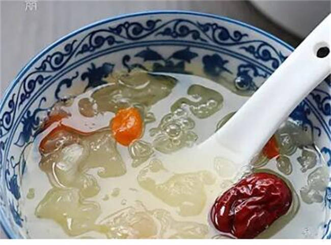 个小时,如果是夏季的话,要放在冰箱里面浸泡,当桃胶变软,体积增大之后,把泡发好的银耳和桃胶一起放进砂锅,然后放上点枸杞,桂圆,红枣,冰糖一起熬煮,如果不爱吃太甜的话,也可以不用放冰糖,因为桂圆和红枣都带有甜味儿。