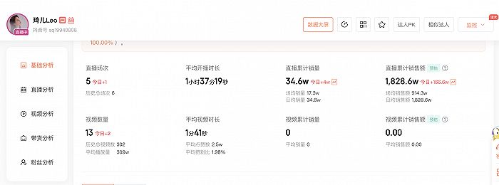 5月7日,琦儿在某短视频平台开启了首场带货直播,此次直播时长长达5小时。根据数据显示,本次直播销售额达1828.6万元。