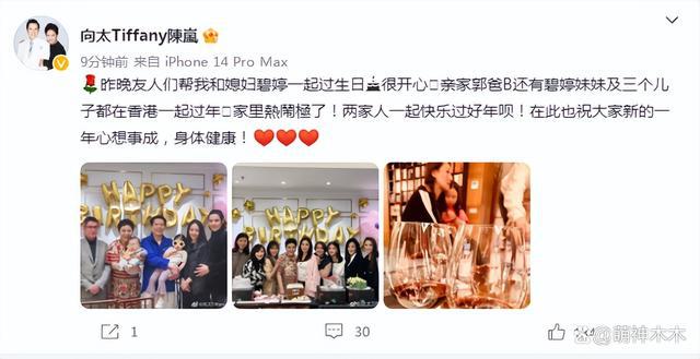 1 月 16 日,向太在个人社交平台上晒出热气腾腾的全家福照片,之前郭碧婷和向佐的婚姻引发了关注,向太迟迟未正面回应,让大家非常忧心,如今,向太终于晒照给了大家一颗定心丸,也使得传闻不攻自破。