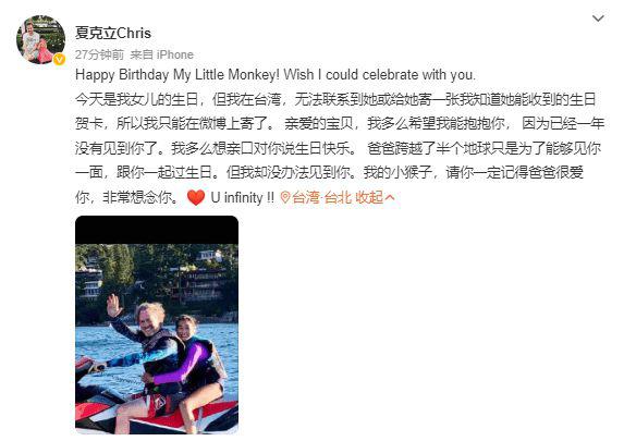 夏克立发文为女儿庆生:一年没见,爸爸很想你