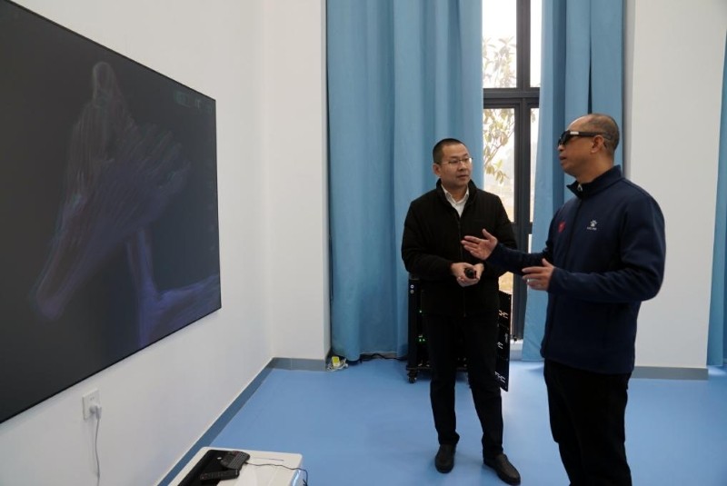 2月17日,在广西体育高等专科学校,韦军与运动健康学院的老师交流,了解3D模拟运动解剖模型如何助力教学。新华社记者 陈露缘 摄