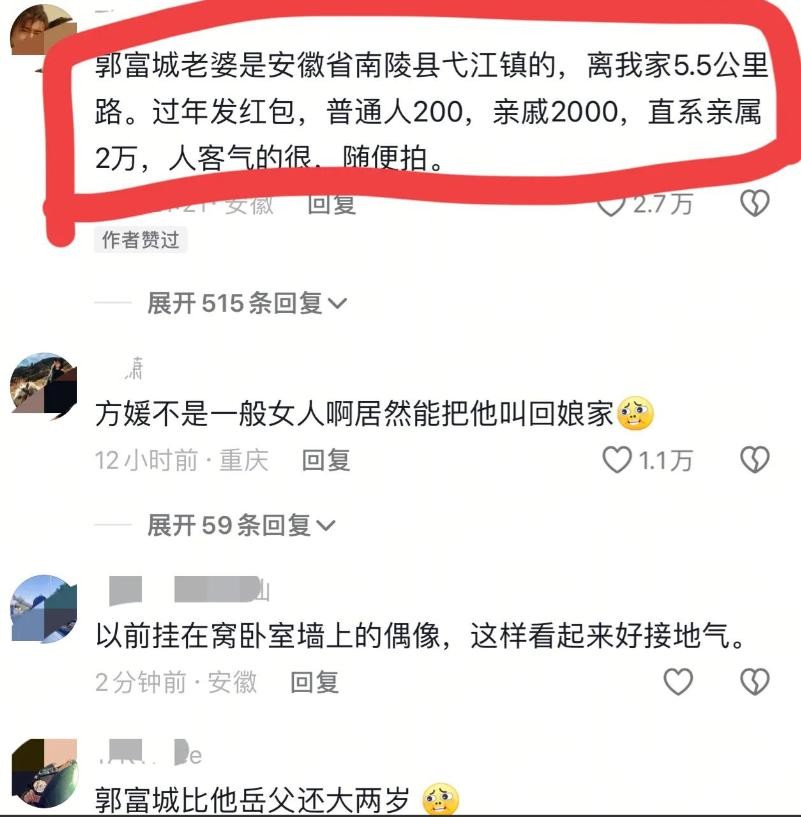 至于网友关心的郭富城与岳父的年龄差距,据了解,方媛出生于 1989 年,郭富城出生于 1965 年,两人相差 24 岁 。虽然年龄差距较大,但婚姻生活更多是两个人的事,只要夫妻恩爱,家庭和睦,年龄差距也并非不可逾越的鸿沟 。关于郭富城给岳父岳母包红包的金额,并没有确切的报道,不过以郭富城的经济实力和对家人的疼爱,想必红包不会薄 。