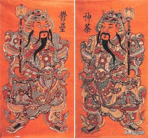 传说在古代,有一座度朔山,山上有一棵大桃树,枝干蜿蜒伸展三千里。在桃树枝丫的东北方有一个鬼门,是万鬼出入的地方。在这里,有两位神将,一个叫神荼,一个叫郁垒。他们负责看守鬼门,如果发现有恶鬼为非作歹,就用苇索把恶鬼捆起来,拿去喂老虎。